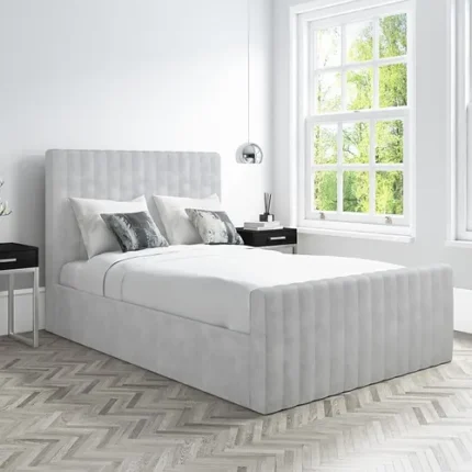 Features: High-end, soft-touch beige velvet upholstery Showing off modern vertical stitching With under-bed storage, it is fashionable and functional. Tall,