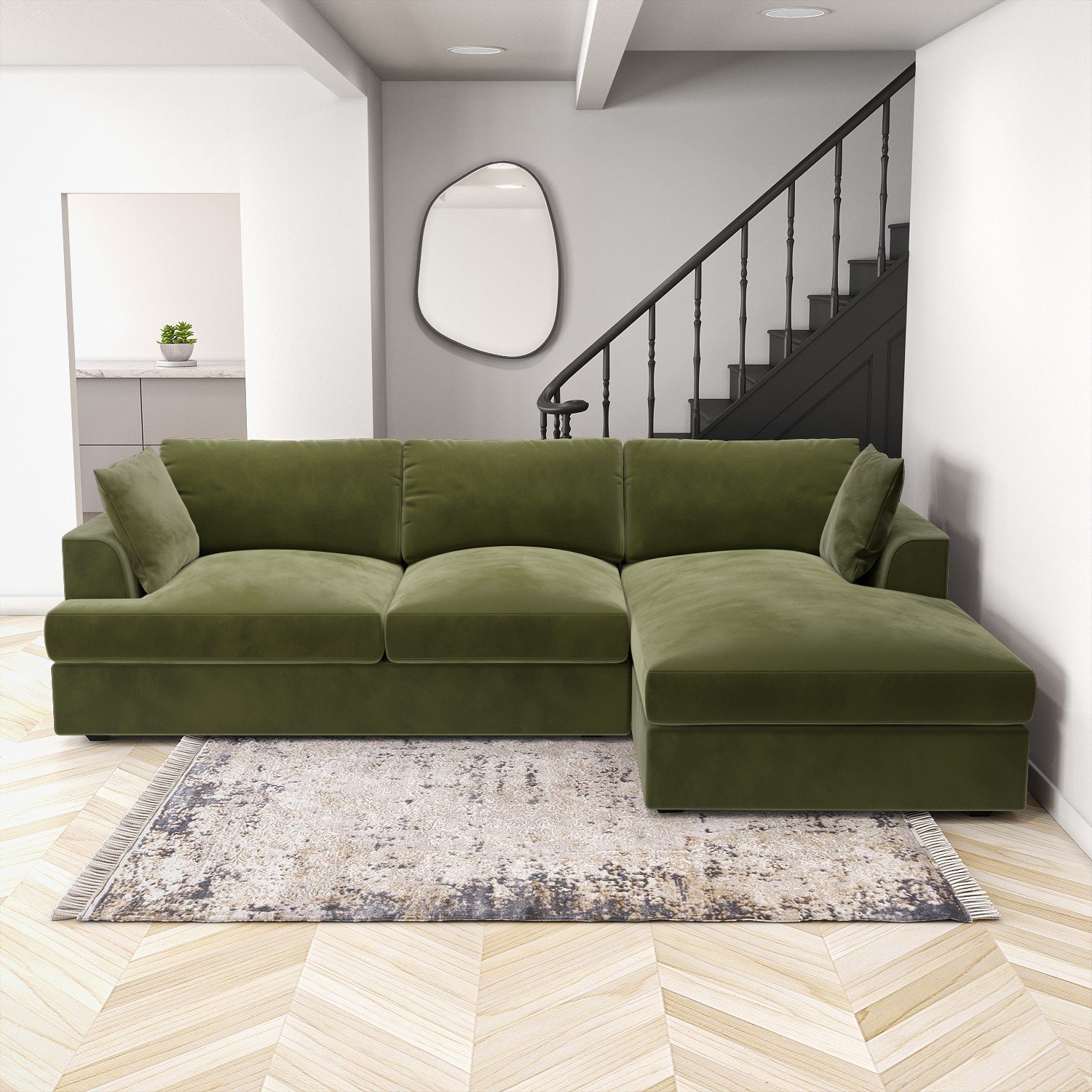 Olive sofas stand out visibly from those in neutral tones. This style is ageless and will always be in vogue. With its well-designed piping, dark wood legs, and attractive piping, it exudes style. It is therefore the ideal accent piece for any room.