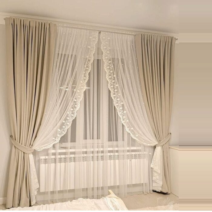 Elevate your interior with this Beige Luxe Curtain Set, designed to blend elegance with functionality. The set includes soft beige blackout curtains that provide excellent privacy and light control, paired with delicate white sheer curtains featuring intricate floral embroidery and subtle dotted patterns.
