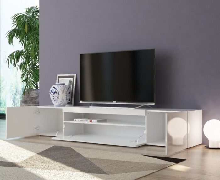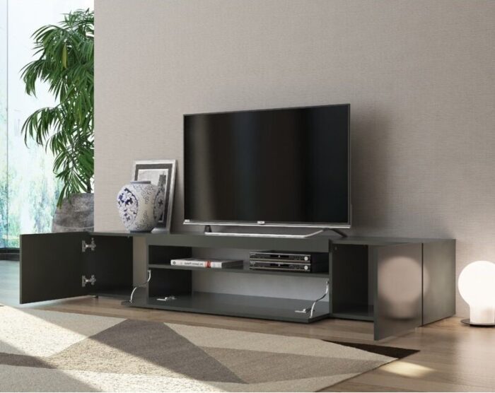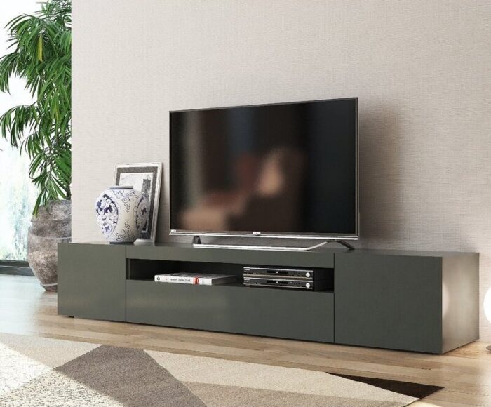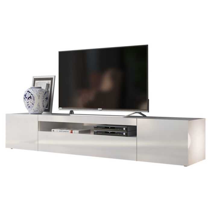 For keeping objects you need every day, this TV stand offers a rectangular design and two or three cabinets, depending on the size you desire. The top easily supports a wide range of television sets with various widths. A tiny shelf that fits game consoles, DVD/Blu-ray players, and live streaming equipment is located in the middle of the unit.