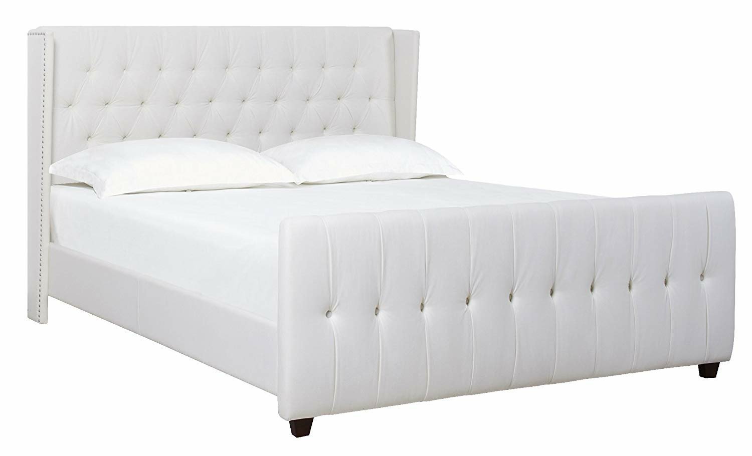 With this magnificent bed, your bedroom will be elevated. With its wingback style, button tufting, and nail head accent, the bed gracefully matches any decor. The bed readily matches your style because it comes in beige, dark grey, or grey.