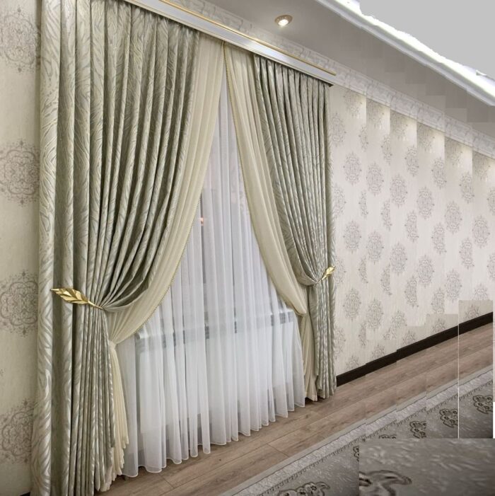 Embrace the richness of classical design with the Imperial Elegance Embossed Curtain Set — a luxurious window treatment crafted for timeless interiors. This exquisite set features intricately embossed outer drapes in a soft sage-gold tone with subtle metallic shimmer, beautifully paired with pleated ivory inner panels and a delicate white sheer curtain. The gold-accented leaf holdbacks add a regal touch, enhancing the opulence of the overall design.