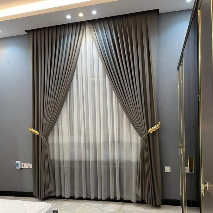 This is a premium window treatment set featuring elegant floor-length blackout curtains in a deep grey tone, combined with an inner layer of white sheer voile curtains. The blackout curtains are neatly pleated for a structured, luxurious look and are held open with golden decorative tiebacks shaped like leaves, adding a touch of opulence. The sheer curtains allow diffused natural light while maintaining privacy. Perfect for modern bedrooms or living spaces seeking both style and functionality.