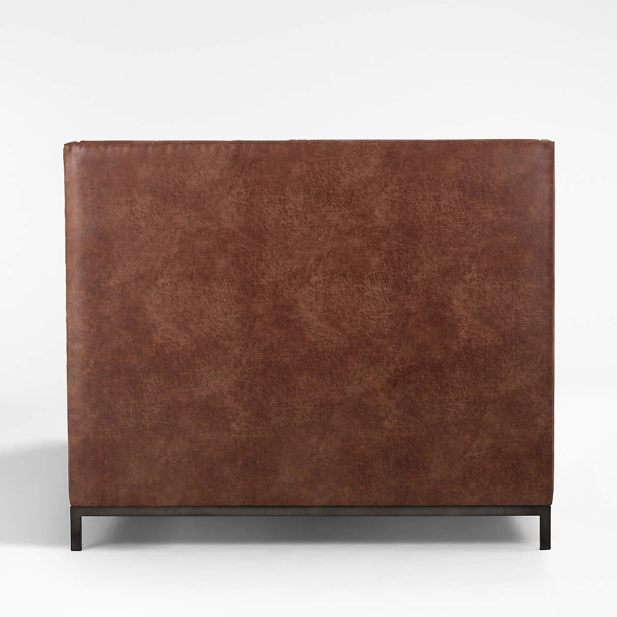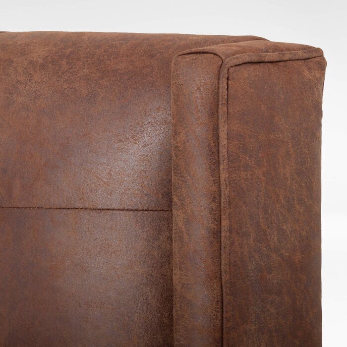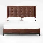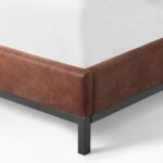 This fabric bed frame is covered in faux leather upholstery from the footboard to the incredibly tall headboard. A luxurious design, it lends any bedroom a posh, sophisticated feel, and the rich finishing adds a natural touch of modernity. Simple iron legs and a frame with a gunmetal finish lighten the appearance and provide linear interest. The brown fake leather bed, which is fully upholstered on all sides, may be arranged in many ways to fit your space.