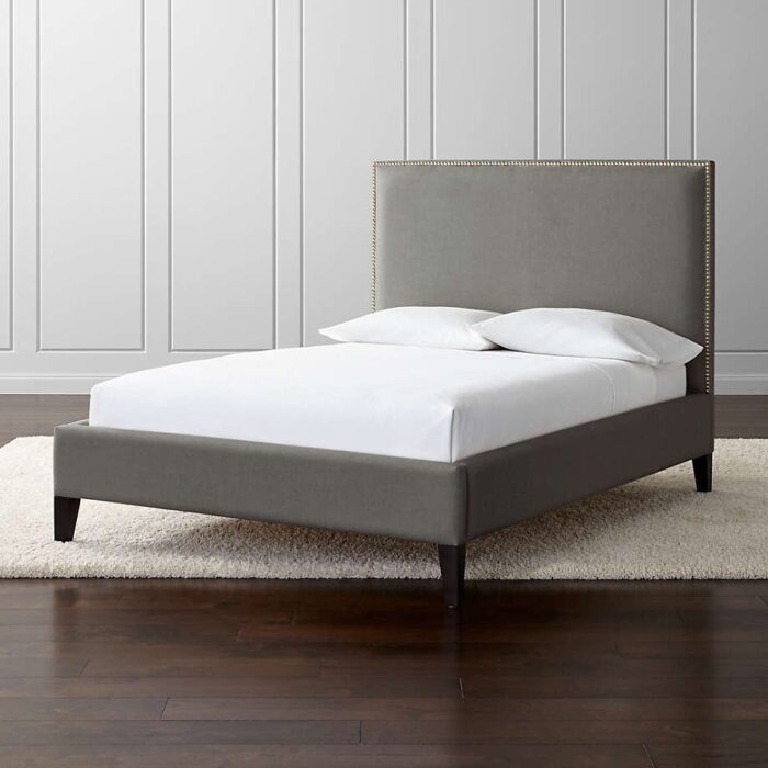With an unobtrusive straight back and a soft natural linen blend, this simple fabric upholstered bed adds elegance and sophistication to the bedroom. It is completed with hand-applied, distinctive brushed pewter railheads. The sturdy, curving legs of this bed are lacquered in black.