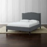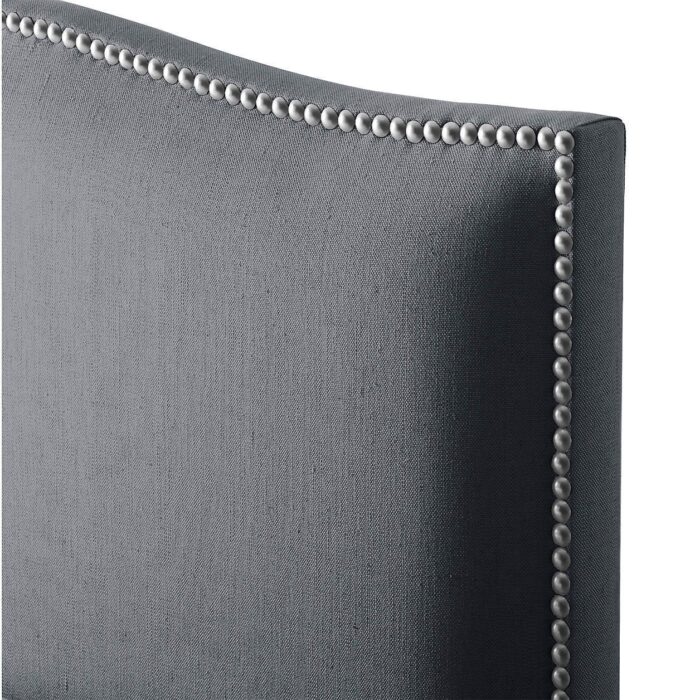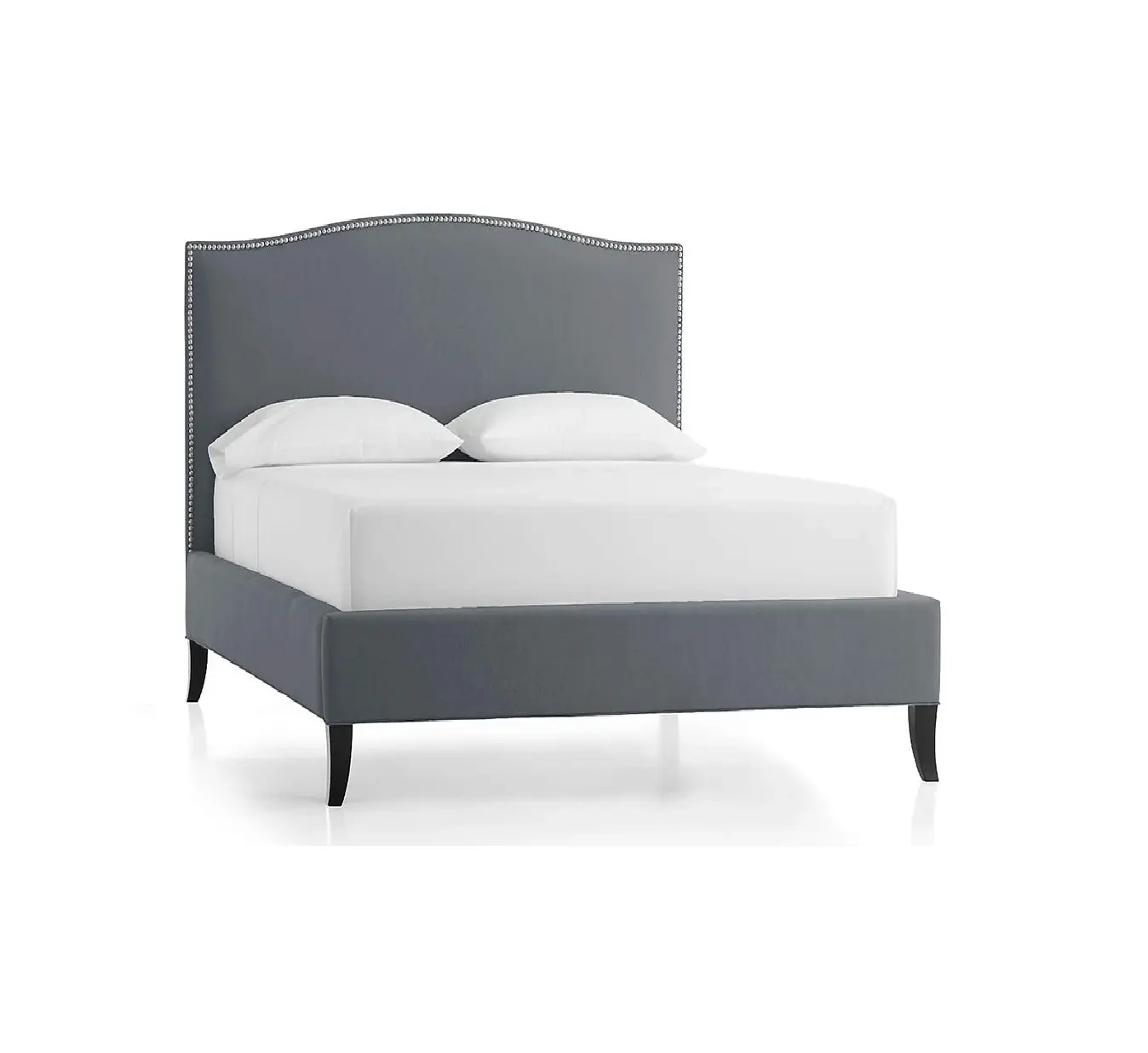 With an unobtrusive curving camelback in a soft natural linen mix and hand-applied, one-at-a-time characteristic brushed pewter nailheads, this simple fabric upholstered bed adds elegance and sophistication to the bedroom. The sturdy, curving legs of this bed are lacquered in black.