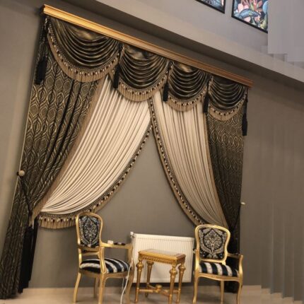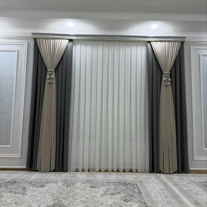 Add a touch of sophistication to your space with this Triple-Layer Elegant Curtain Set, featuring a graceful blend of modern style and classic charm. The design includes a sheer white inner layer for soft light diffusion, framed by contrasting taupe pleated curtains and dark charcoal blackout panels for full privacy and light control. Finished with decorative tassel tiebacks and mounted under a sleek pelmet, this curtain set is perfect for living rooms, bedrooms, or formal settings.